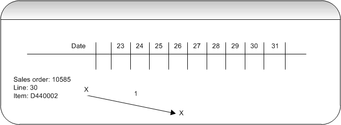 The following describes what happens in the Time axis file during the re-planning in update mode. The first group of information (in tables) outlines the purchase order selected in and the sales order lines that contain these items. The second group of information (graphical illustrations) outlines the “movement” or actions taken during the re-planning for each sales order line.