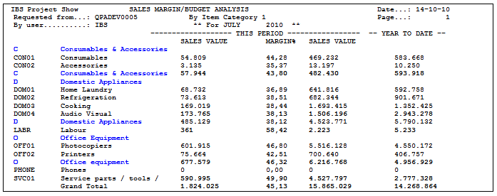 Only the break levels defined in the Break level text table (C, D and O) are printed. The text defined for each break level is also printed (i.e. Consumables & Accessories, Domestic Appliances and Office Equipment).